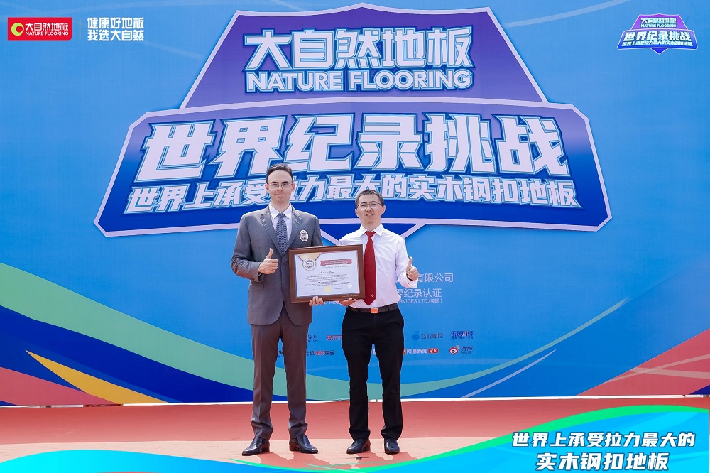 经福布斯世界纪录认证官方机构认证官现场记录并宣布:大自然实木钢扣地板最大的承受拉力为12806N,世界上承受拉力最大的实木钢扣地板——大自然地板世界纪录挑战成功。随后,在全体嘉宾、媒体、现场观众和线上广大消费者的见证下,福布斯世界纪录认证官方机构认证官为大自然家居授予世界纪录称号奖牌,现场掌声雷霆,欢呼爆发。